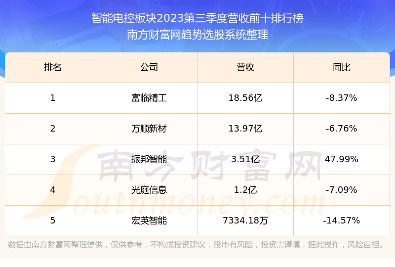 按照南方财富网趋势选股系统统计,该股所属板块为智能电控板块,该板块共有5只股票,伯特利2023第三季度营收在该板块中排名为第5名,该板块2023第三季度营收排名前十的股票如下表: