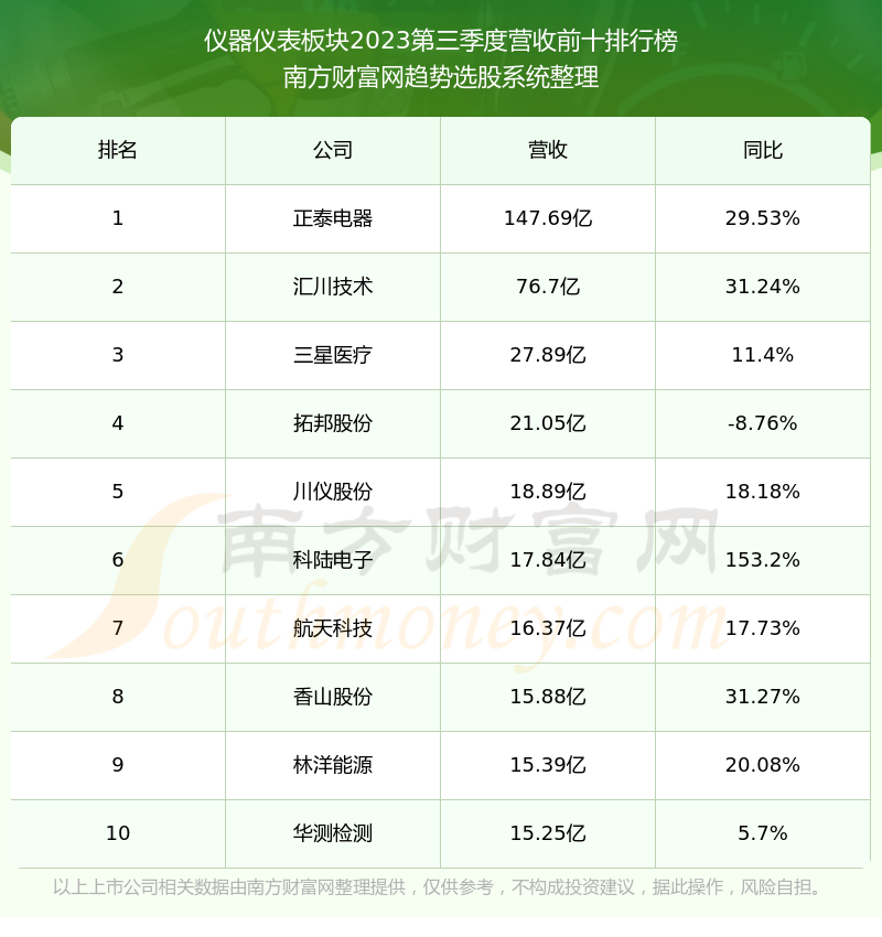 按照南方财富网趋势选股系统统计,该股所属板块为仪器仪表板块,该板块共有106只股票,中控技术2023第三季度营收在该板块中排名为第106名,该板块2023第三季度营收排名前十的股票如下表: