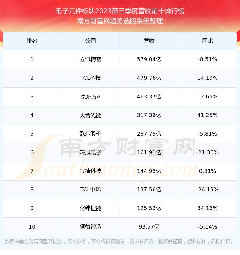 按照南方财富网趋势选股系统统计,该股所属板块为电子元件板块,该板块共有360只股票,博敏电子2023第三季度营收在该板块中排名为第135名,该板块2023第三季度营收排名前十的股票如下表: