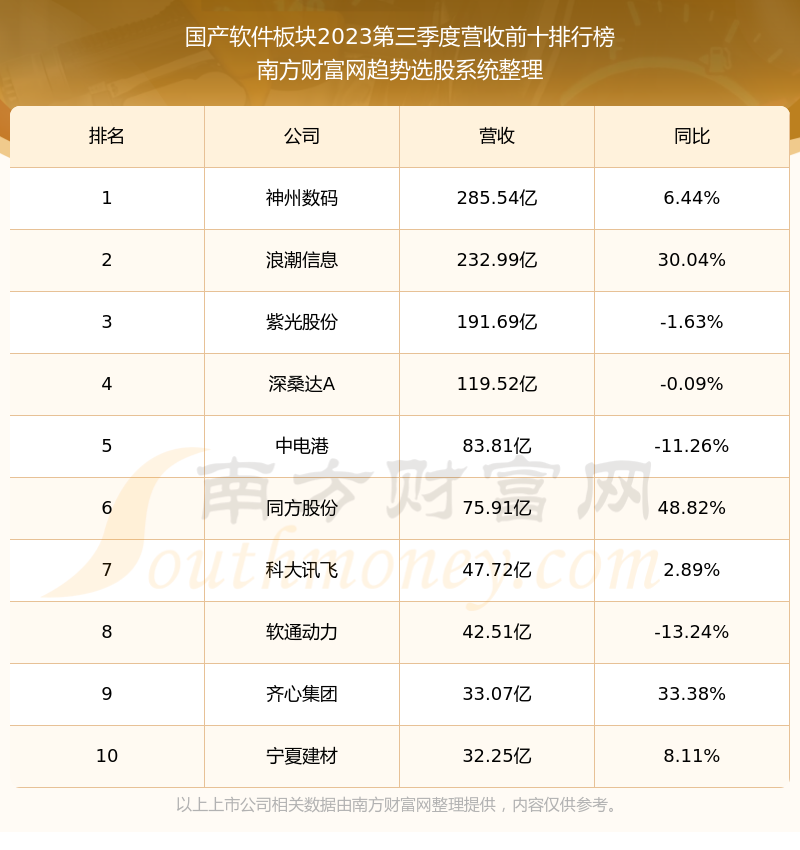 按照南方财富网趋势选股系统统计,该股所属板块为国产软件板块,该板块共有334只股票,复旦复华2023第三季度营收在该板块中排名为第203名,该板块2023第三季度营收排名前十的股票如下表: