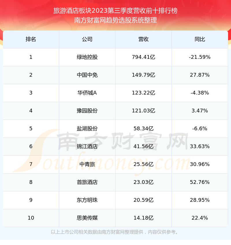 按照南方财富网趋势选股系统统计,该股所属板块为旅游酒店板块,该板块共有62只股票,中青旅2023第三季度营收在该板块中排名为第7名,该板块2023第三季度营收排名前十的股票如下表: