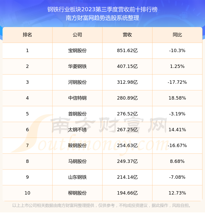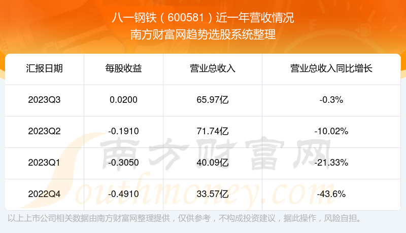 按照南方财富网趋势选股系统统计,该股所属板块为钢铁行业板块,该板块共有39只股票,八一钢铁2023第三季度营收在该板块中排名为第23名,该板块2023第三季度营收排名前十的股票如下表: