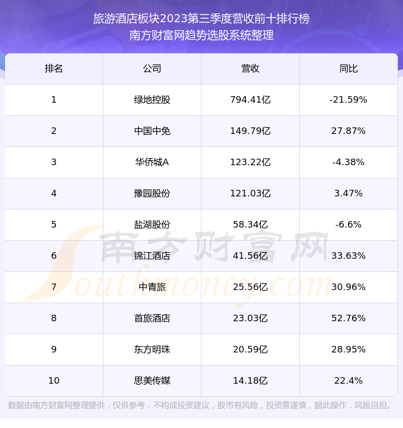 按照南方财富网趋势选股系统统计,该股所属板块为旅游酒店板块,该板块共有62只股票,大连圣亚2023第三季度营收在该板块中排名为第42名,该板块2023第三季度营收排名前十的股票如下表: