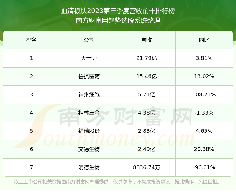 按照南方财富网趋势选股系统统计,该股所属板块为血清板块,该板块共有7只股票,赛伦生物2023第三季度营收在该板块中排名为第7名,该板块2023第三季度营收排名前十的股票如下表: