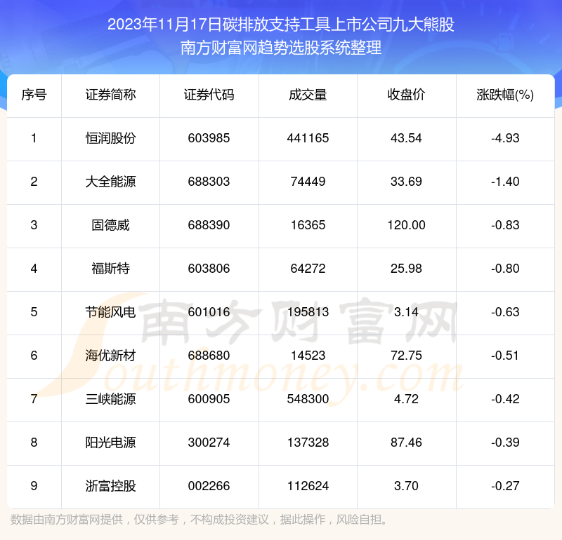 截止2023年11月17日,个股表现方面,碳排放支持工具上市公司当日领跌股为恒润股份(603985),该股当日报收43.54,上涨-4.93%,成交量44.12万。大全能源(688303)以下跌-1.40%紧随其后,该股当日成交量7.44万。此外,固德威(688390)、福斯特(603806)、节能风电(601016)均进入当日碳排放支持工具上市公司熊股之列。