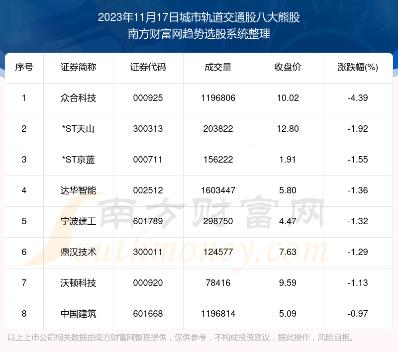 截止2023年11月17日,个股表现方面,城市轨道交通股当日领跌股为众合科技(000925),该股当日报收10.02,上涨-4.39%,成交量119.68万。*ST天山(300313)以下跌-1.92%紧随其后,该股当日成交量20.38万。此外,*ST京蓝(000711)、达华智能(002512)、宁波建工(601789)均进入当日城市轨道交通股熊股之列。