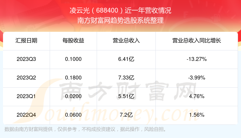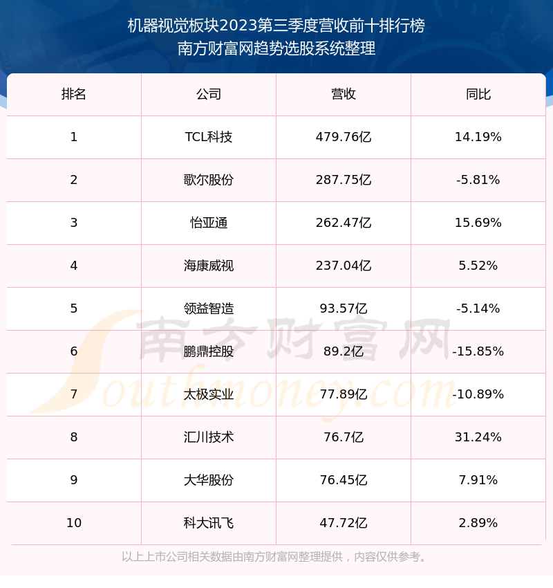 按照南方财富网趋势选股系统统计,该股所属板块为机器视觉板块,该板块共有149只股票,凌云光2023第三季度营收在该板块中排名为第41名,该板块2023第三季度营收排名前十的股票如下表: