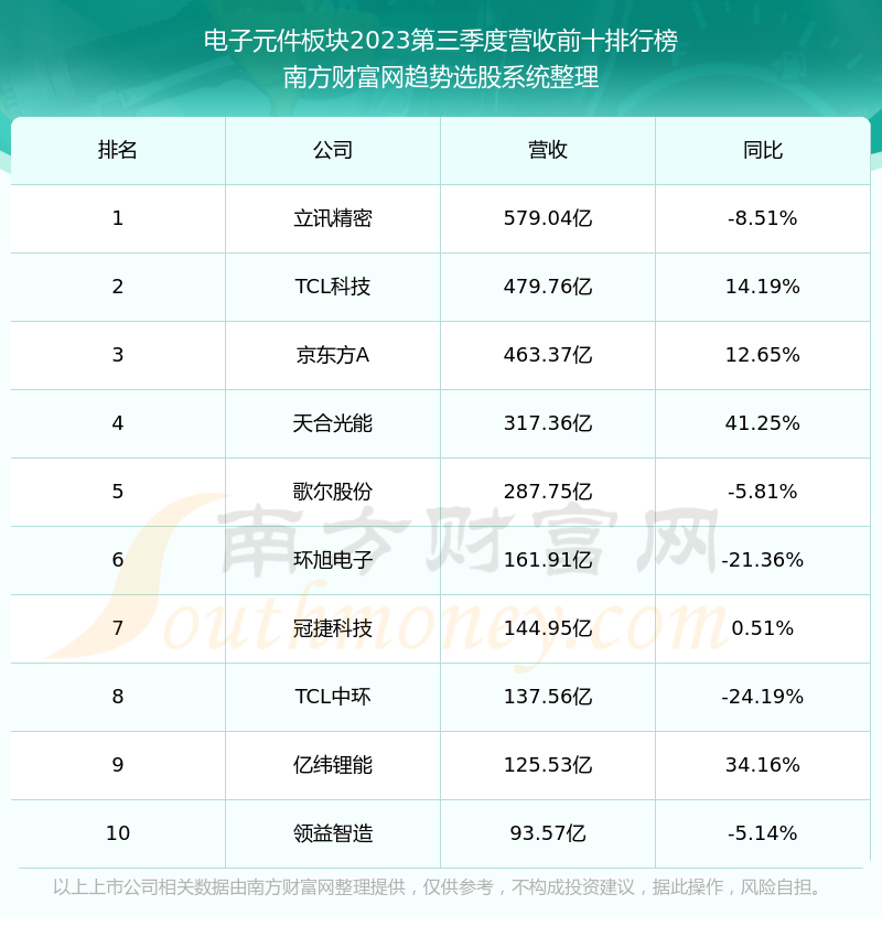 按照南方财富网趋势选股系统统计,该股所属板块为电子元件板块,该板块共有360只股票,维科技术2023第三季度营收在该板块中排名为第177名,该板块2023第三季度营收排名前十的股票如下表: