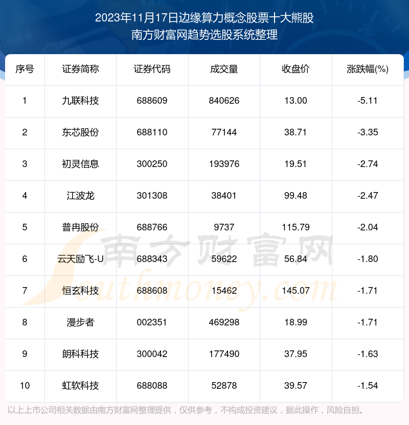 截止2023年11月17日,个股表现方面,边缘算力概念股票当日领跌股为九联科技(688609),该股当日报收13.00,上涨-5.11%,成交量84.06万。东芯股份(688110)以下跌-3.35%紧随其后,该股当日成交量7.71万。此外,初灵信息(300250)、江波龙(301308)、普冉股份(688766)均进入当日边缘算力概念股票熊股之列。