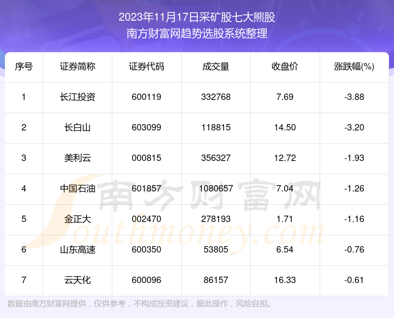 截止2023年11月17日,个股表现方面,采矿股当日领跌股为长江投资(600119),该股当日报收7.69,上涨-3.88%,成交量33.28万。长白山(603099)以下跌-3.20%紧随其后,该股当日成交量11.88万。此外,美利云(000815)、中国石油(601857)、金正大(002470)均进入当日采矿股熊股之列。