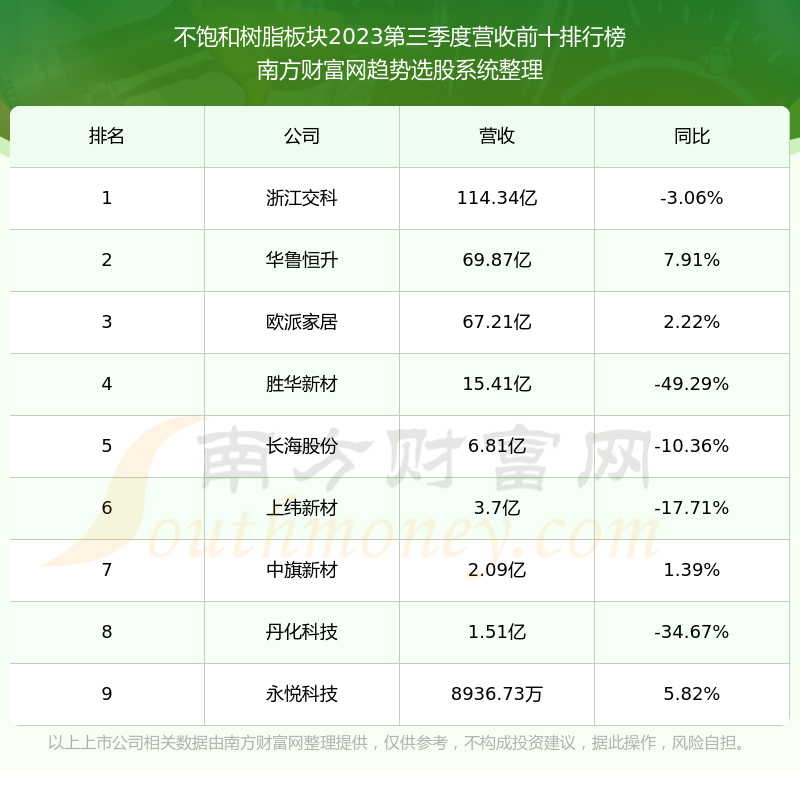 按照南方财富网趋势选股系统统计,该股所属板块为不饱和树脂板块,该板块共有9只股票,永悦科技2023第三季度营收在该板块中排名为第9名,该板块2023第三季度营收排名前十的股票如下表: