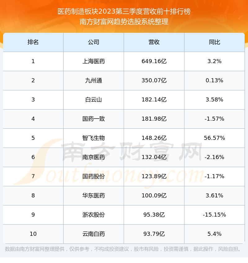 按照南方财富网趋势选股系统统计,该股所属板块为医药制造板块,该板块共有283只股票,西藏药业2023第三季度营收在该板块中排名为第122名,该板块2023第三季度营收排名前十的股票如下表:
