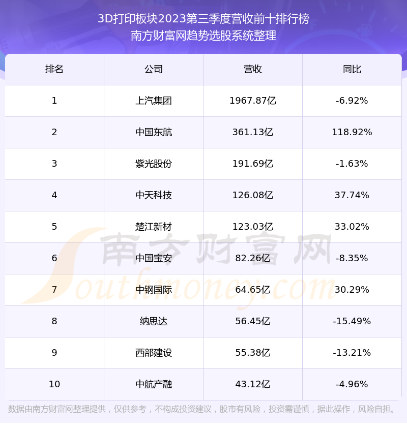 按照南方财富网趋势选股系统统计,该股所属板块为3D打印板块,该板块共有100只股票,铂力特2023第三季度营收在该板块中排名为第67名,该板块2023第三季度营收排名前十的股票如下表: