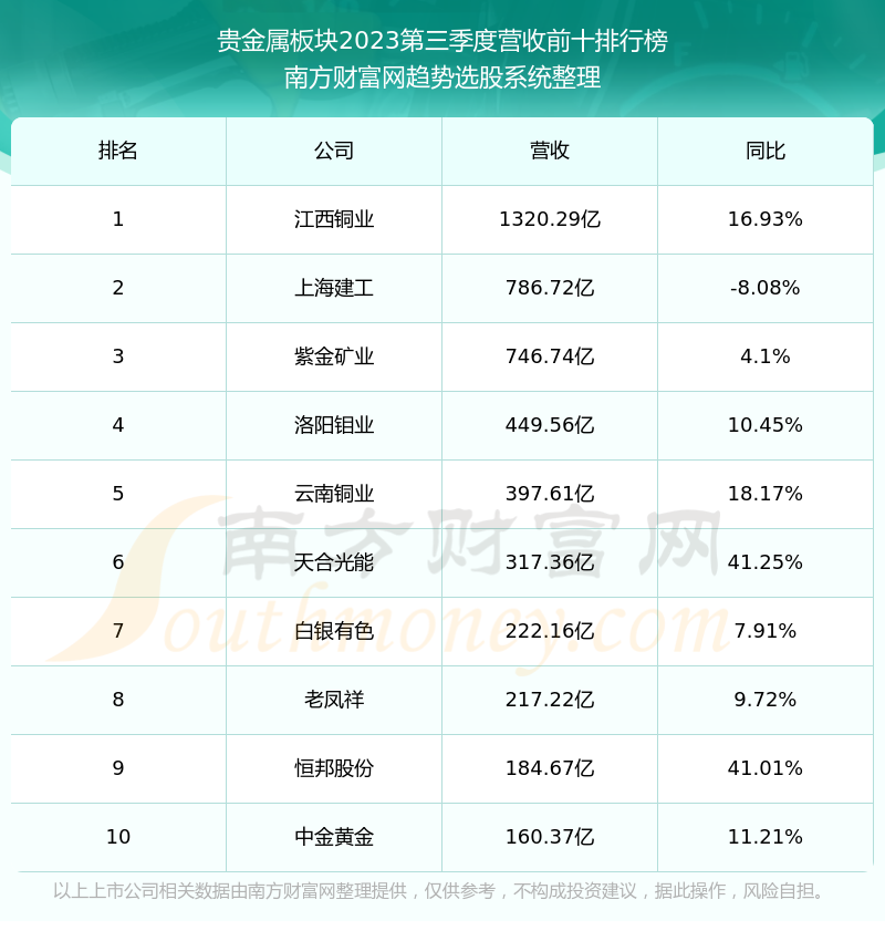按照南方财富网趋势选股系统统计,该股所属板块为贵金属板块,该板块共有74只股票,西部黄金2023第三季度营收在该板块中排名为第46名,该板块2023第三季度营收排名前十的股票如下表: