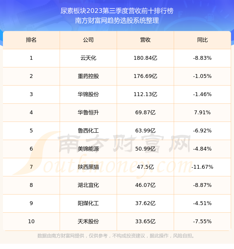 按照南方财富网趋势选股系统统计,该股所属板块为尿素板块,该板块共有26只股票,赤天化2023第三季度营收在该板块中排名为第23名,该板块2023第三季度营收排名前十的股票如下表: