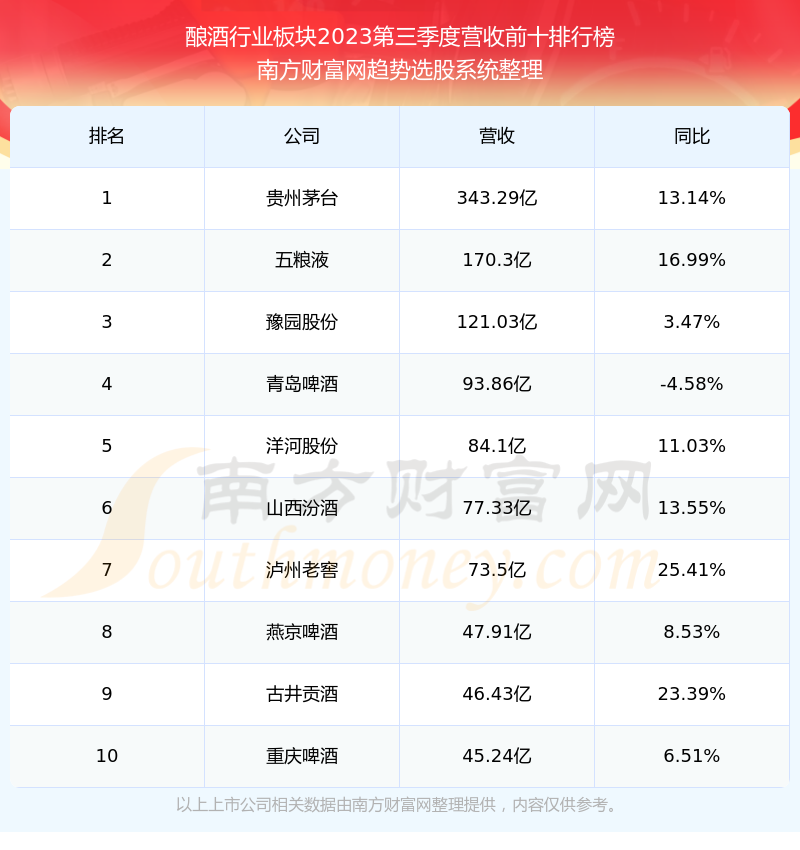 按照南方财富网趋势选股系统统计,该股所属板块为酿酒行业板块,该板块共有42只股票,*ST莫高2023第三季度营收在该板块中排名为第39名,该板块2023第三季度营收排名前十的股票如下表: