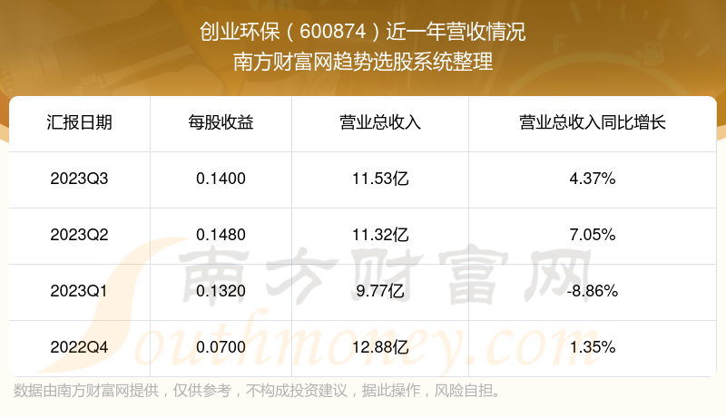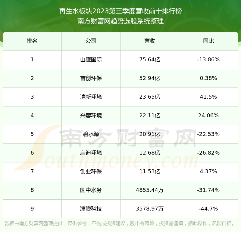 按照南方财富网趋势选股系统统计,该股所属板块为再生水板块,该板块共有9只股票,创业环保2023第三季度营收在该板块中排名为第7名,该板块2023第三季度营收排名前十的股票如下表:
