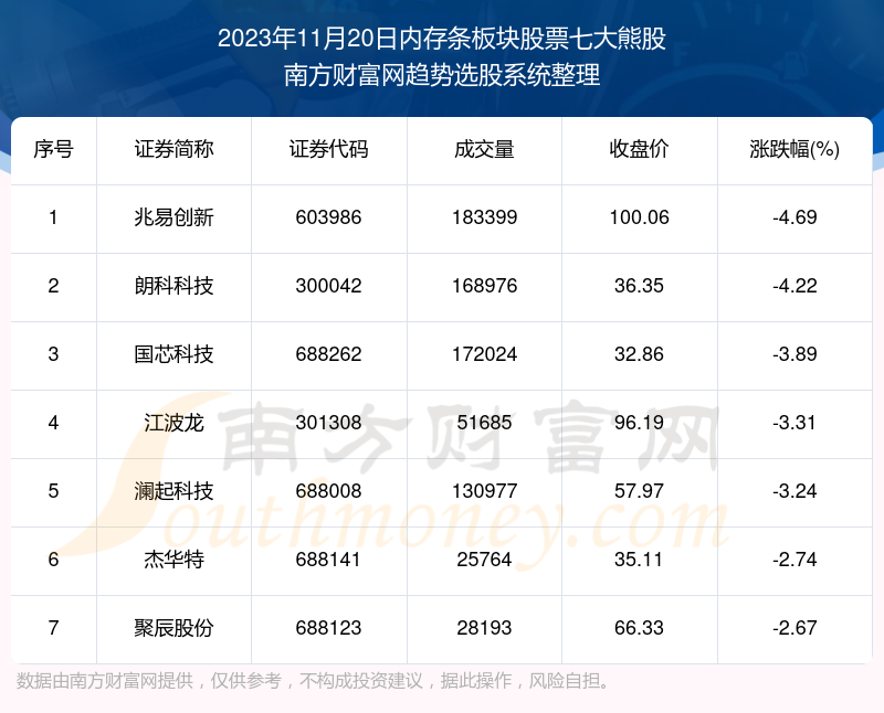 截止2023年11月20日,个股表现方面,内存条板块股票当日领跌股为兆易创新(603986),该股当日报收100.06,上涨-4.69%,成交量18.34万。朗科科技(300042)以下跌-4.22%紧随其后,该股当日成交量16.9万。此外,国芯科技(688262)、江波龙(301308)、澜起科技(688008)均进入当日内存条板块股票熊股之列。