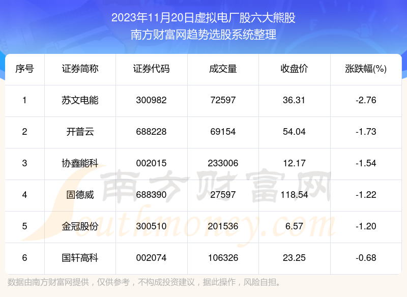 以上内容就是对【正规股票配资平台 数据解盘|2023年11月20日虚拟电厂股六大熊股名单】的解答,如果解决了您的问题欢迎把链接分享给朋友(https://www.youge168.com/mod_article-article_content-article_id-50622.html)