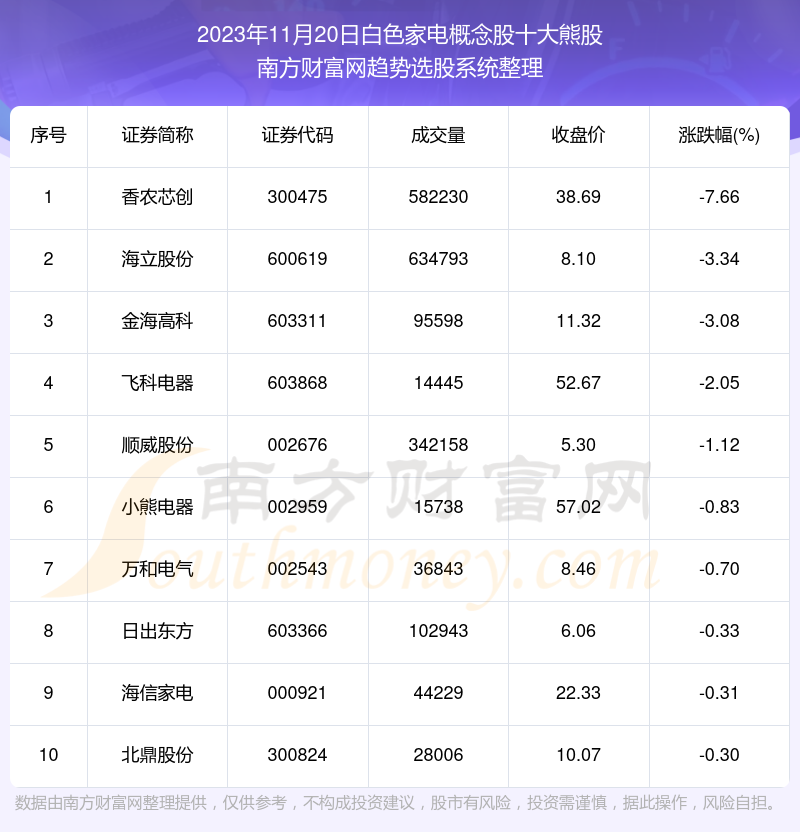 截止2023年11月20日,个股表现方面,白色家电概念股当日领跌股为香农芯创(300475),该股当日报收38.69,上涨-7.66%,成交量58.22万。海立股份(600619)以下跌-3.34%紧随其后,该股当日成交量63.48万。此外,金海高科(603311)、飞科电器(603868)、顺威股份(002676)均进入当日白色家电概念股熊股之列。