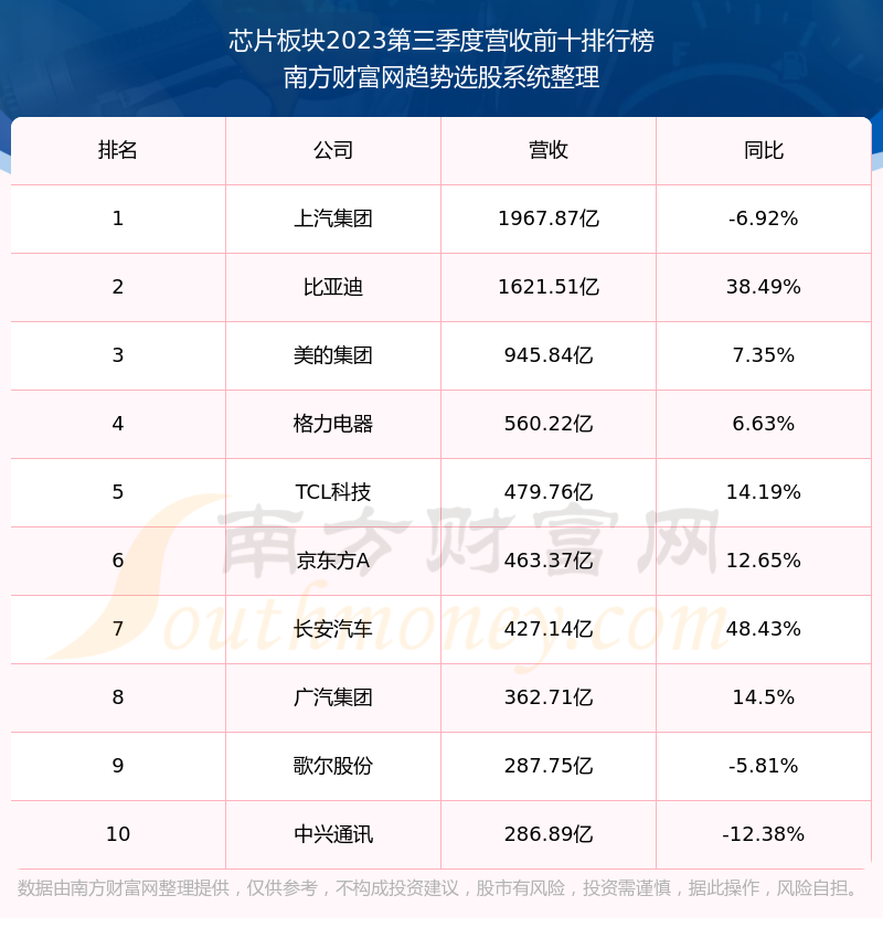 按照南方财富网趋势选股系统统计,该股所属板块为芯片板块,该板块共有541只股票,源杰科技2023第三季度营收在该板块中排名为第532名,该板块2023第三季度营收排名前十的股票如下表: