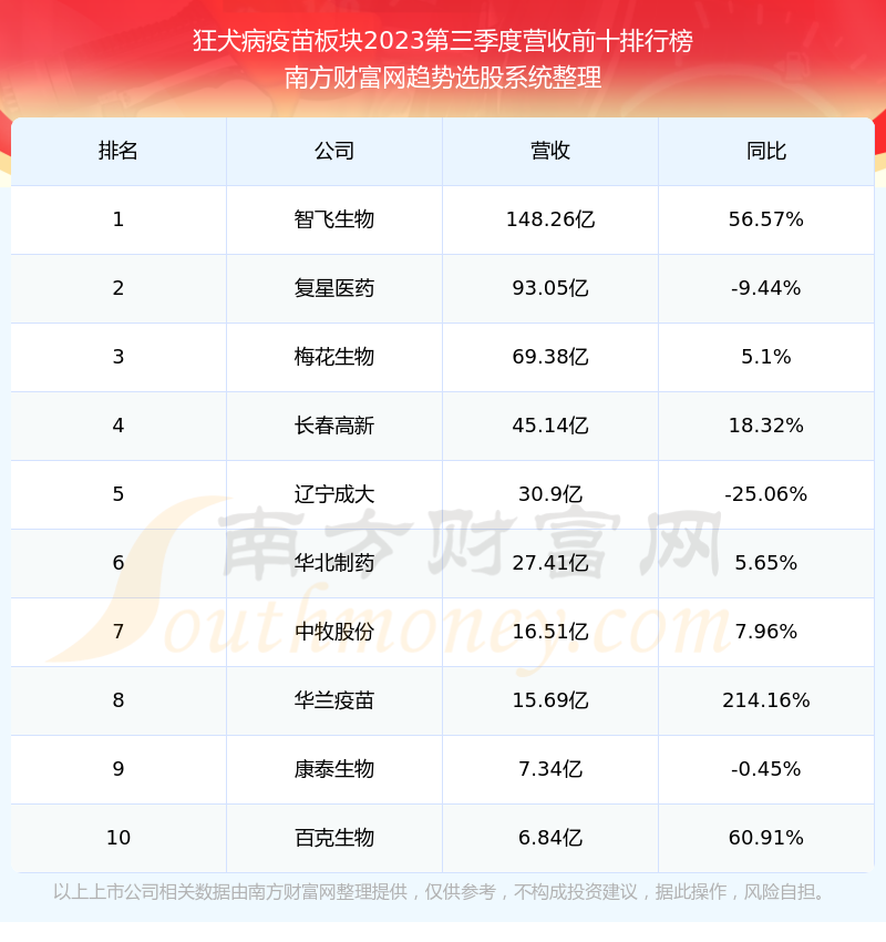 按照南方财富网趋势选股系统统计,该股所属板块为狂犬病疫苗板块,该板块共有19只股票,成大生物2023第三季度营收在该板块中排名为第13名,该板块2023第三季度营收排名前十的股票如下表: