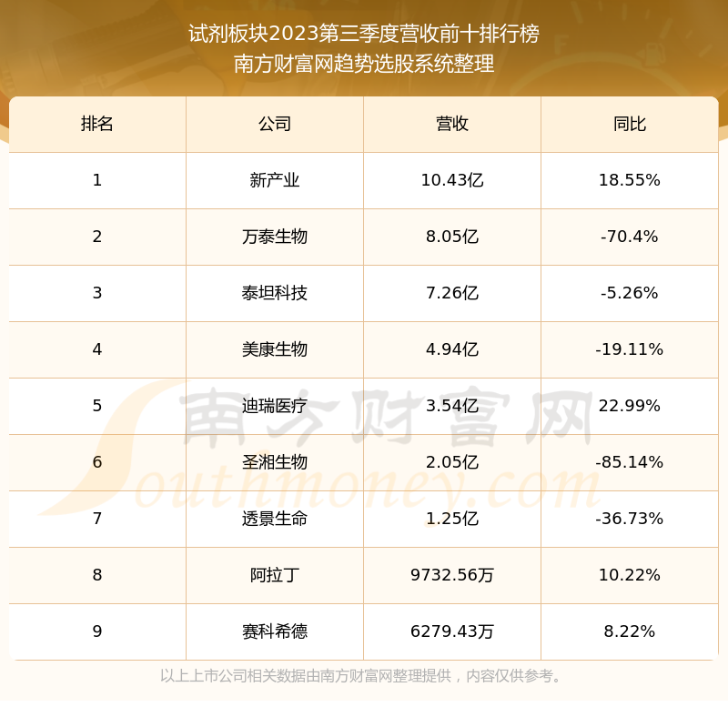 按照南方财富网趋势选股系统统计,该股所属板块为试剂板块,该板块共有9只股票,浩欧博2023第三季度营收在该板块中排名为第9名,该板块2023第三季度营收排名前十的股票如下表: