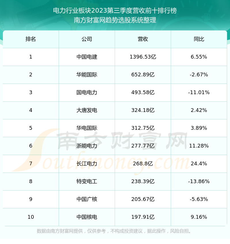 按照南方财富网趋势选股系统统计,该股所属板块为电力行业板块,该板块共有93只股票,川投能源2023第三季度营收在该板块中排名为第69名,该板块2023第三季度营收排名前十的股票如下表: