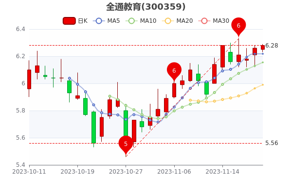 截止12时,全通教育报6.280元,涨0.32%,总市值39.77亿元。