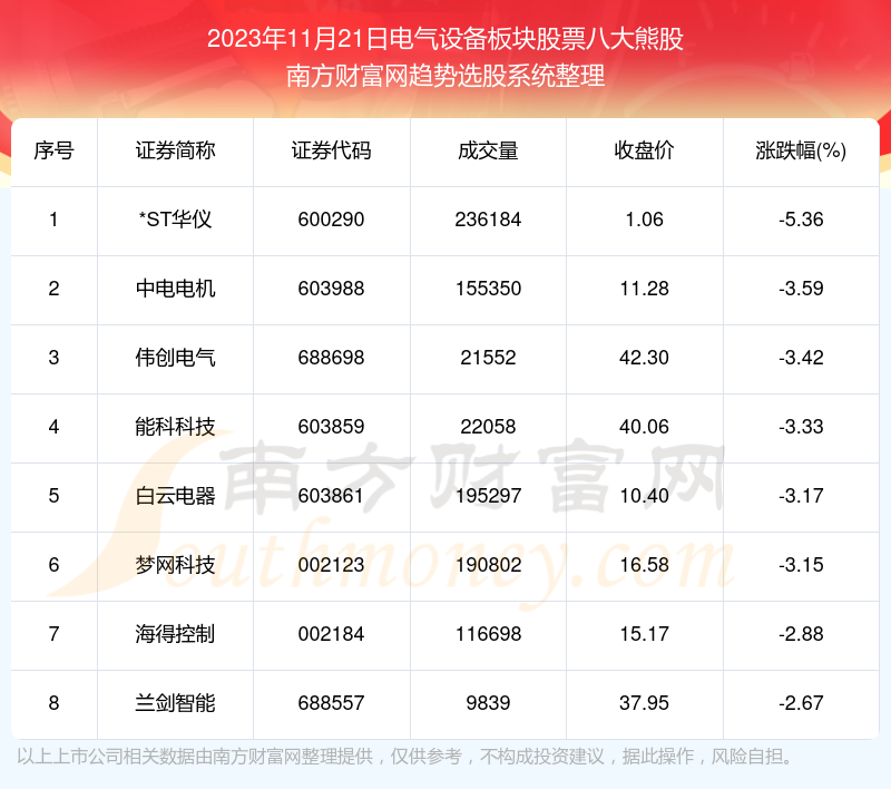 截止2023年11月21日,个股表现方面,电气设备板块股票当日领跌股为*ST华仪(600290),该股当日报收1.06,上涨-5.36%,成交量23.62万。中电电机(603988)以下跌-3.59%紧随其后,该股当日成交量15.54万。此外,伟创电气(688698)、能科科技(603859)、白云电器(603861)均进入当日电气设备板块股票熊股之列。