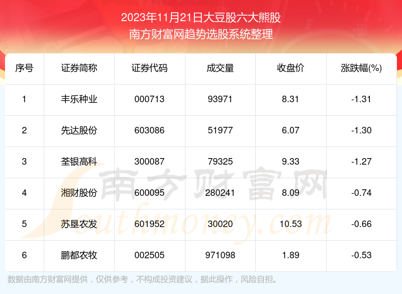 截止2023年11月21日,个股表现方面,大豆股当日领跌股为丰乐种业(000713),该股当日报收8.31,上涨-1.31%,成交量9.4万。先达股份(603086)以下跌-1.30%紧随其后,该股当日成交量5.2万。此外,荃银高科(300087)、湘财股份(600095)、苏垦农发(601952)均进入当日大豆股熊股之列。