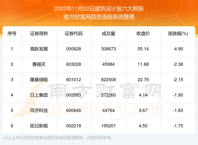 截止2023年11月22日,个股表现方面,建筑设计股当日领跌股为高新发展(000628),该股当日报收55.14,上涨-4.90%,成交量30.87万。赛福天(603028)以下跌-2.38%紧随其后,该股当日成交量4.6万。此外,隆基绿能(601012)、日上集团(002593)、同济科技(600846)均进入当日建筑设计股熊股之列。