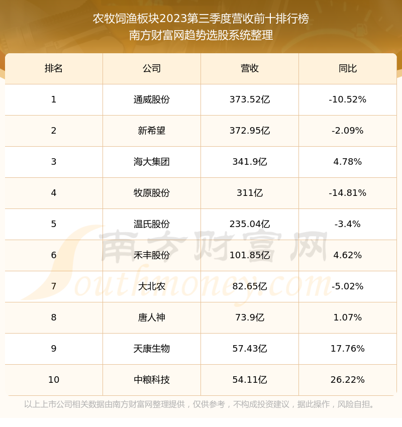 按照南方财富网趋势选股系统统计,该股所属板块为农牧饲渔板块,该板块共有79只股票,福成股份2023第三季度营收在该板块中排名为第63名,该板块2023第三季度营收排名前十的股票如下表: