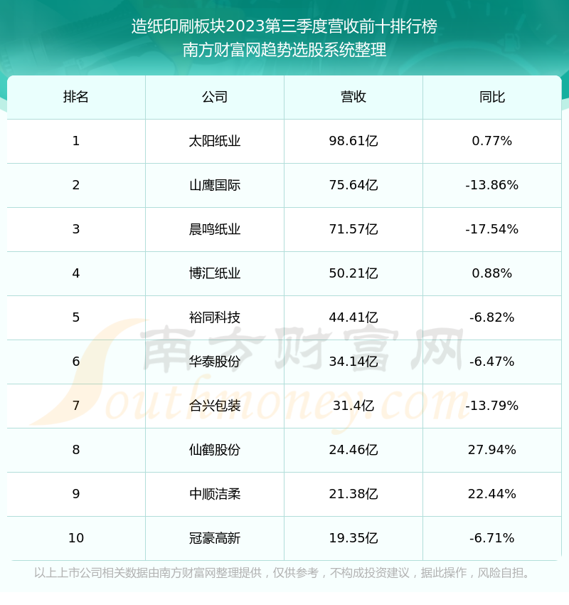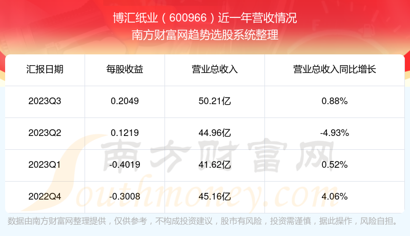 按照南方财富网趋势选股系统统计,该股所属板块为造纸印刷板块,该板块共有48只股票,博汇纸业2023第三季度营收在该板块中排名为第4名,该板块2023第三季度营收排名前十的股票如下表: