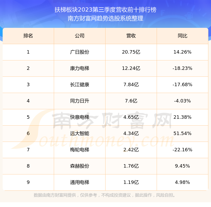 按照南方财富网趋势选股系统统计,该股所属板块为扶梯板块,该板块共有9只股票,梅轮电梯2023第三季度营收在该板块中排名为第7名,该板块2023第三季度营收排名前十的股票如下表:
