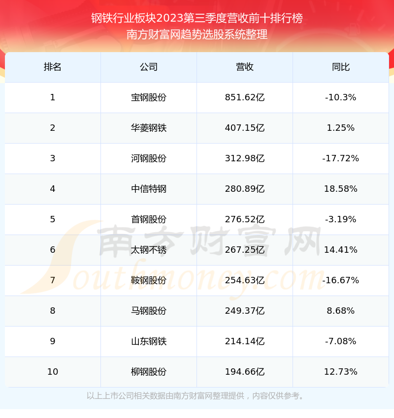 按照南方财富网趋势选股系统统计,该股所属板块为钢铁行业板块,该板块共有39只股票,柳钢股份2023第三季度营收在该板块中排名为第10名,该板块2023第三季度营收排名前十的股票如下表: