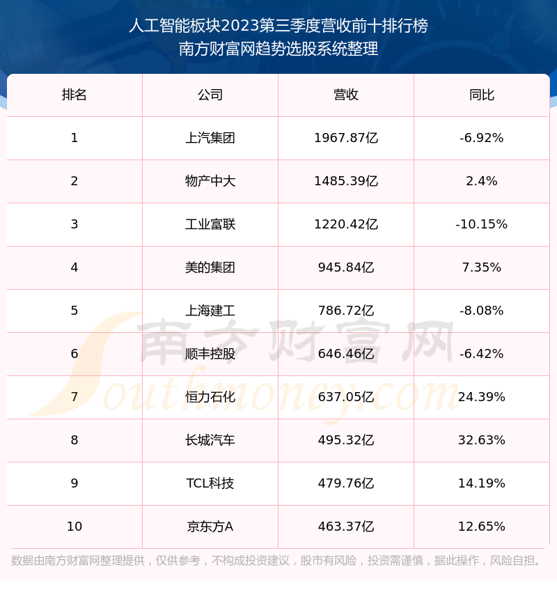 按照南方财富网趋势选股系统统计,该股所属板块为人工智能板块,该板块共有721只股票,泰禾智能2023第三季度营收在该板块中排名为第565名,该板块2023第三季度营收排名前十的股票如下表: