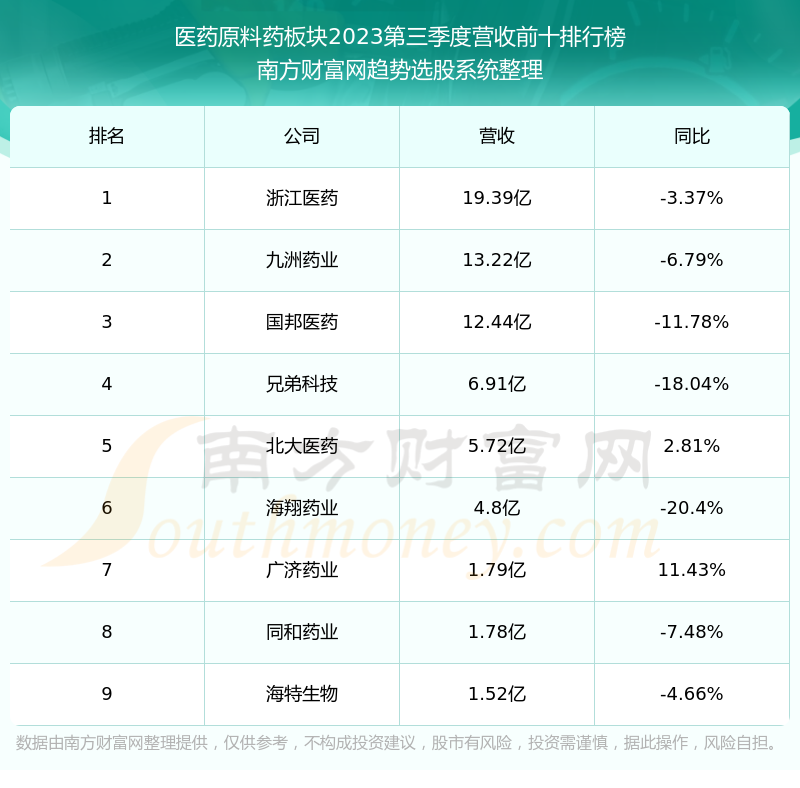 按照南方财富网趋势选股系统统计,该股所属板块为医药原料药板块,该板块共有9只股票,国邦医药2023第三季度营收在该板块中排名为第3名,该板块2023第三季度营收排名前十的股票如下表: