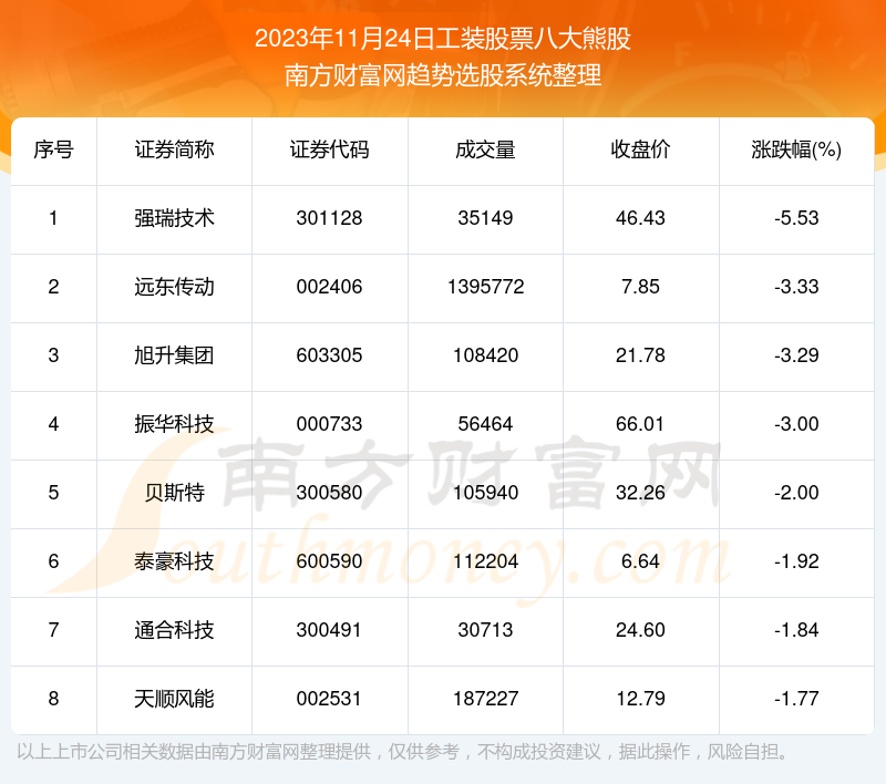 截止2023年11月24日,个股表现方面,工装股票当日领跌股为强瑞技术(301128),该股当日报收46.43,上涨-5.53%,成交量3.51万。远东传动(002406)以下跌-3.33%紧随其后,该股当日成交量139.58万。此外,旭升集团(603305)、振华科技(000733)、贝斯特(300580)均进入当日工装股票熊股之列。