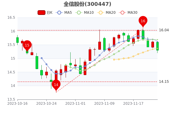 11月24日收盘消息,全信股份开盘报价15.6元,收盘于15.300元。7日内股价下跌2.09%,总市值为47.78亿元。