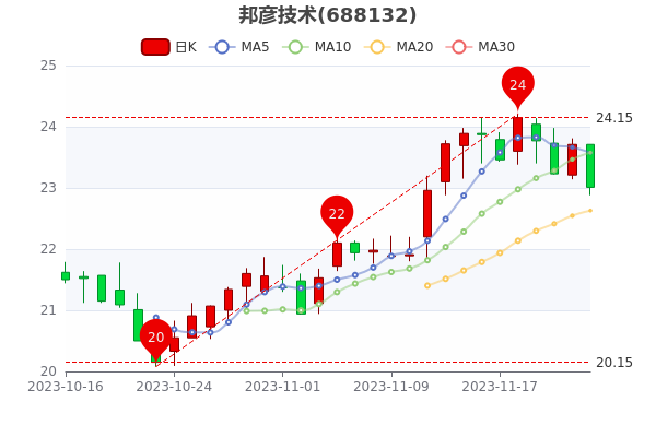 11月24日消息,邦彦技术5日内股价下跌4.95%,今年来涨幅下跌-1.96%,最新报23.010元,市盈率为69.73。