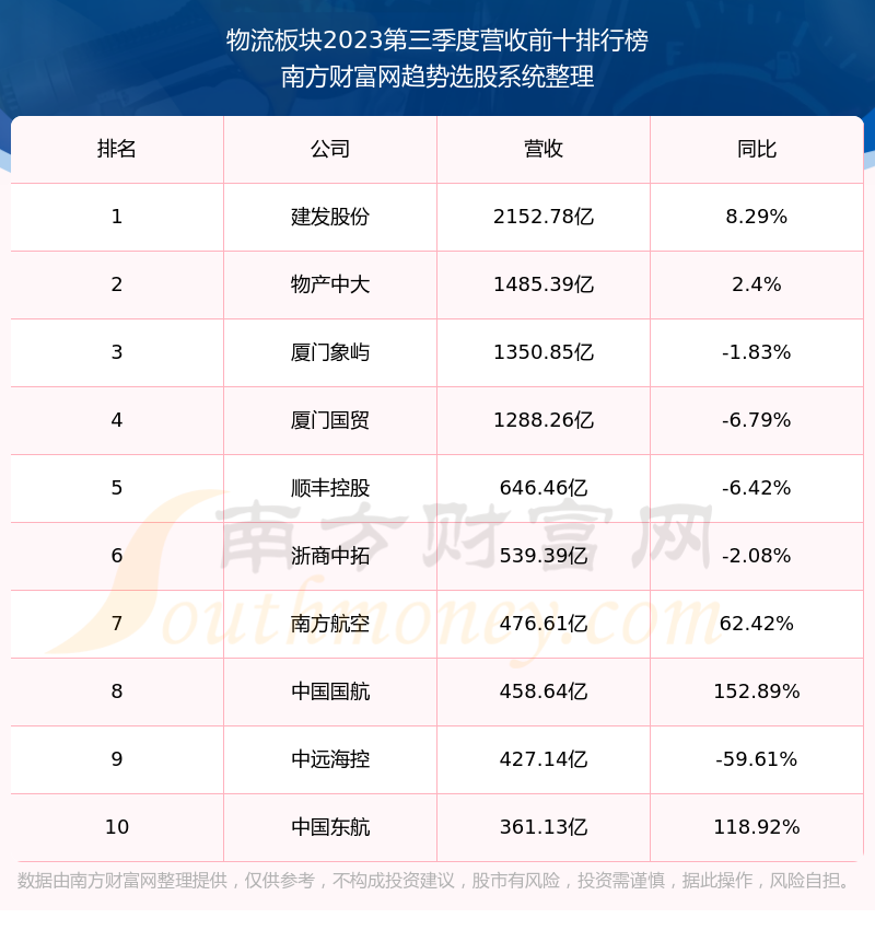 按照南方财富网趋势选股系统统计,该股所属板块为物流板块,该板块共有91只股票,中国外运2023第三季度营收在该板块中排名为第13名,该板块2023第三季度营收排名前十的股票如下表: