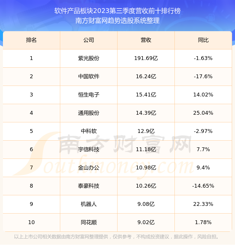按照南方财富网趋势选股系统统计,该股所属板块为软件产品板块,该板块共有28只股票,航天软件2023第三季度营收在该板块中排名为第28名,该板块2023第三季度营收排名前十的股票如下表: