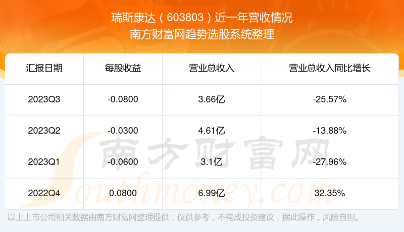 瑞斯康达2023年第三季度公司实现营业收入3.66亿元,同比-25.57%;归母净利润-3646.45万元,同比-336.5%。