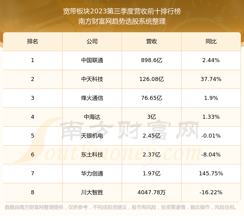 按照南方财富网趋势选股系统统计,该股所属板块为宽带板块,该板块共有8只股票,瑞斯康达2023第三季度营收在该板块中排名为第8名,该板块2023第三季度营收排名前十的股票如下表: