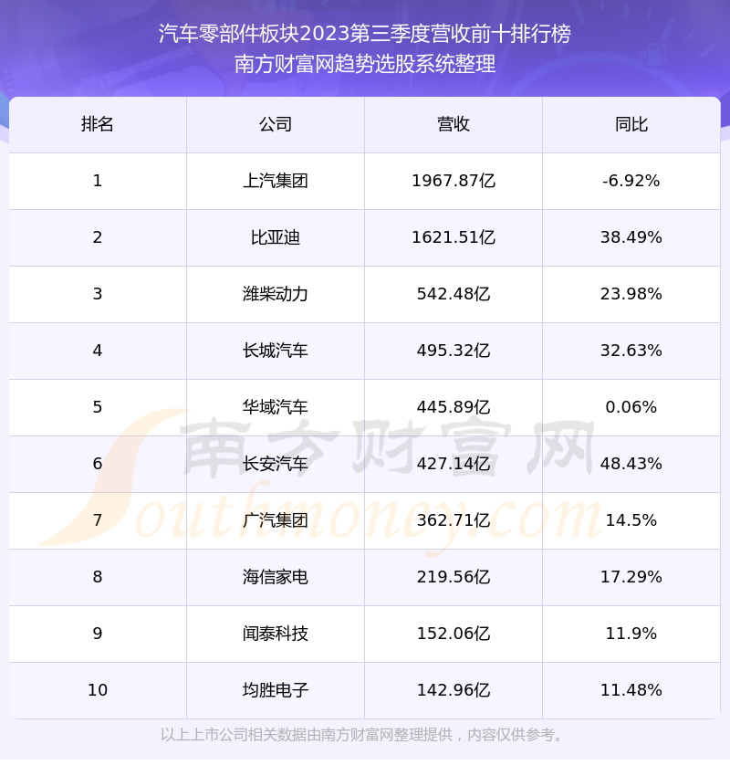 按照南方财富网趋势选股系统统计,该股所属板块为汽车零部件板块,该板块共有443只股票,华培动力2023第三季度营收在该板块中排名为第303名,该板块2023第三季度营收排名前十的股票如下表: