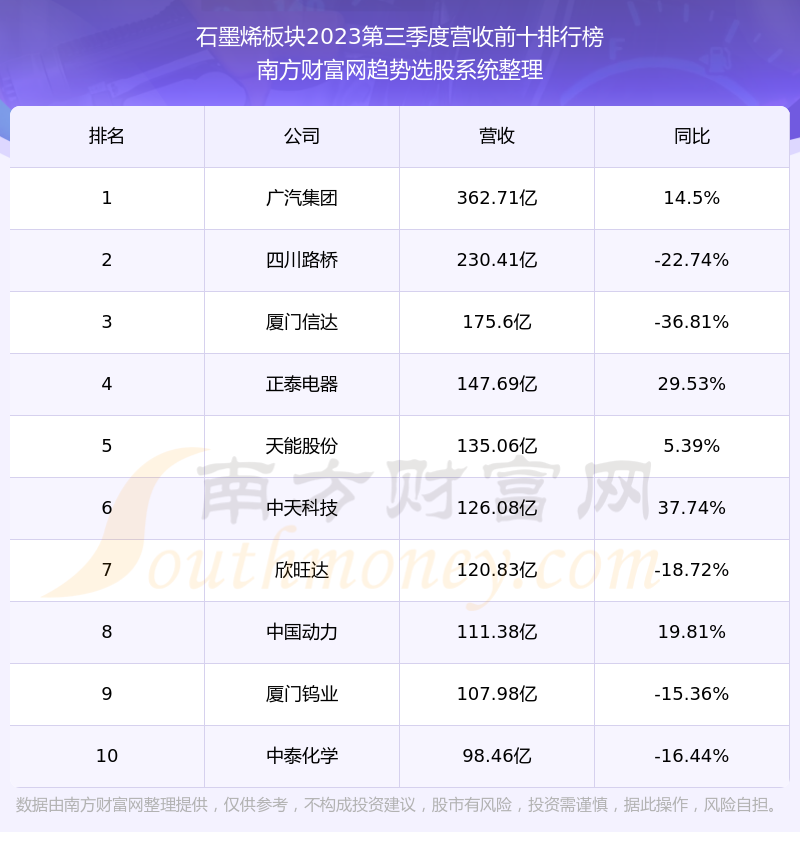 按照南方财富网趋势选股系统统计,该股所属板块为石墨烯板块,该板块共有100只股票,彤程新材2023第三季度营收在该板块中排名为第47名,该板块2023第三季度营收排名前十的股票如下表:
