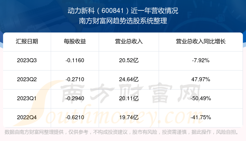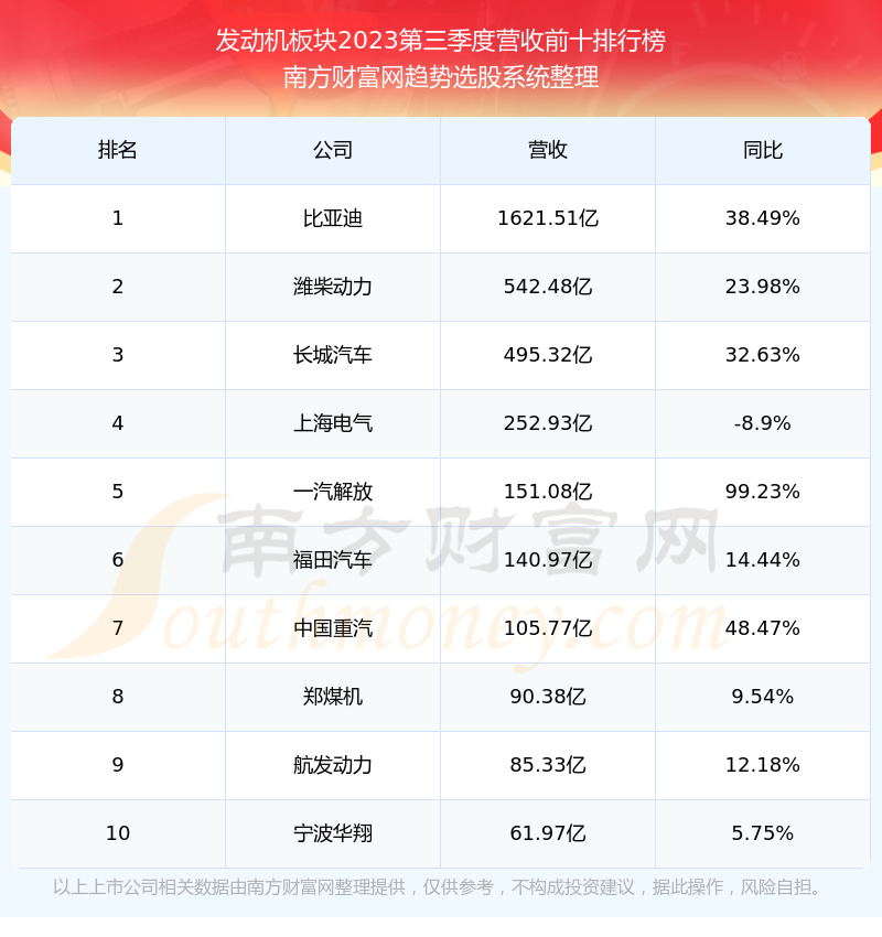 按照南方财富网趋势选股系统统计,该股所属板块为发动机板块,该板块共有123只股票,动力新科2023第三季度营收在该板块中排名为第20名,该板块2023第三季度营收排名前十的股票如下表: