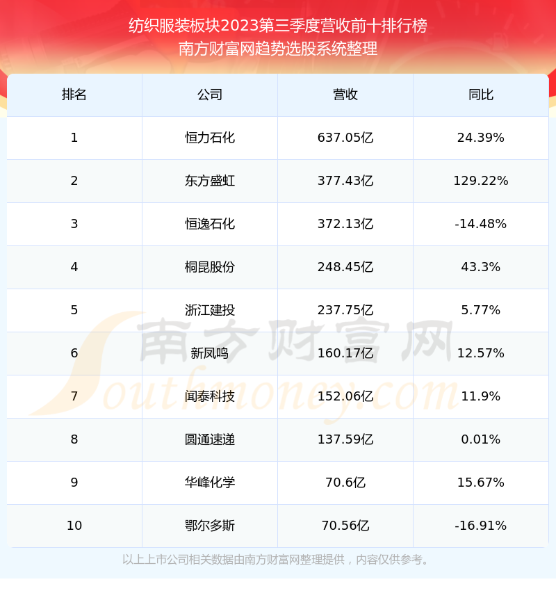 按照南方财富网趋势选股系统统计,该股所属板块为纺织服装板块,该板块共有188只股票,地素时尚2023第三季度营收在该板块中排名为第87名,该板块2023第三季度营收排名前十的股票如下表:
