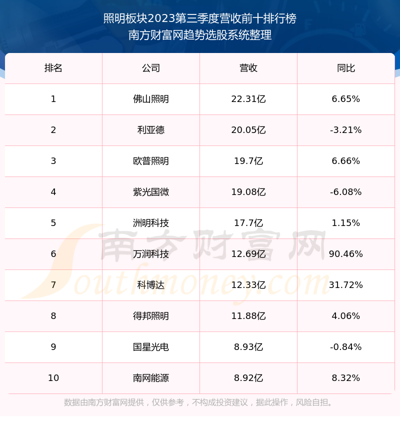按照南方财富网趋势选股系统统计,该股所属板块为照明板块,该板块共有17只股票,科博达2023第三季度营收在该板块中排名为第7名,该板块2023第三季度营收排名前十的股票如下表: